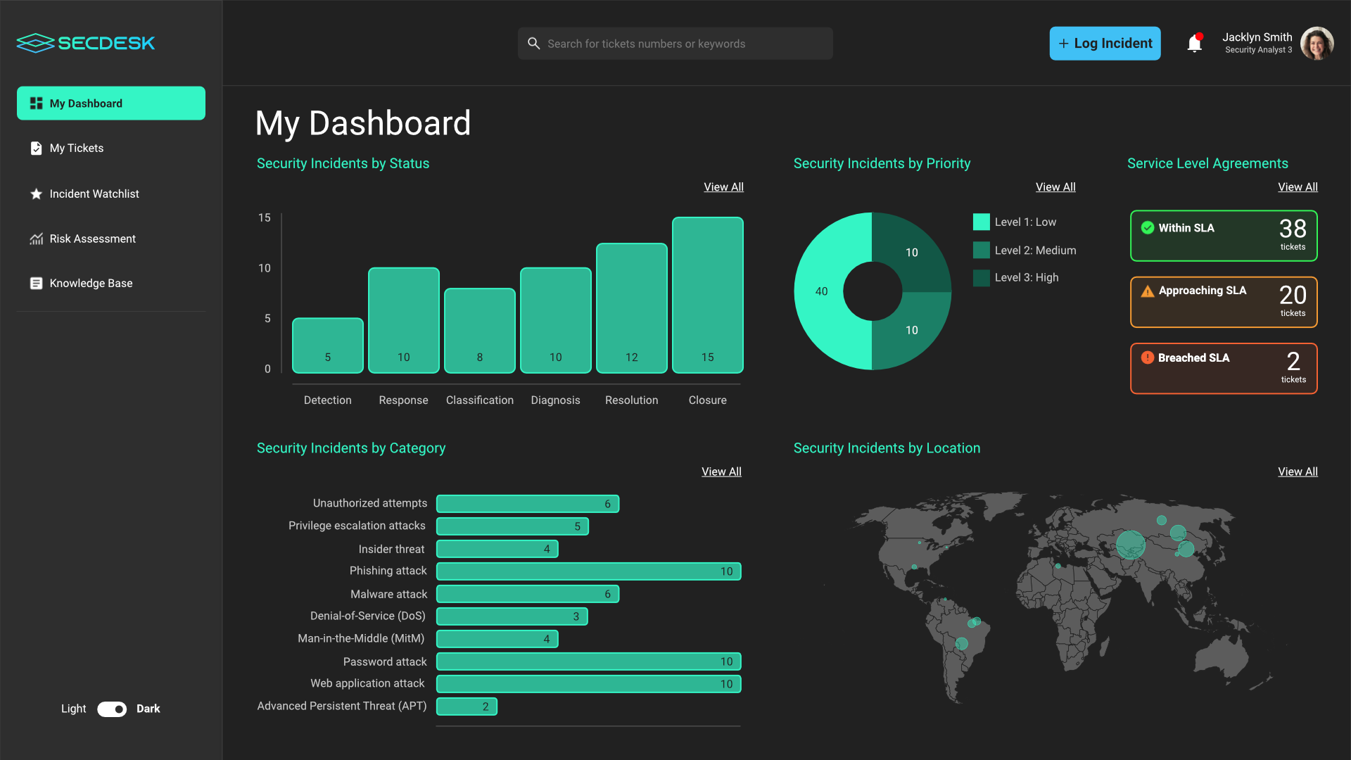 SecDesk was a custom dashboard and IT security incident ticketing prototype for security analysts. These analysts spend their day monitoring, receiving, and logging incidents all day by monitoring a variety of applications. Having to constantly observe, translate, and makes sense of data was very time consuming and mentally exhausting.